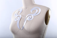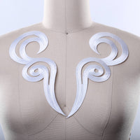 Mirrored shape effect is a perfect addition for a neckline. Perfectly accents any gown or costume, especially those needing an edgy and unique flair. I've personally seen this applique added to many dancer/ figure skating or gymnastics costumes.