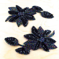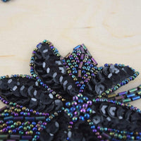 Beautiful and heavily sequined and beaded flower applique in gorgeous and vibrant black color. Beaded in a beautiful purple and green beading for a 1980's vibe. Nostalgic 1980's Color Scheme