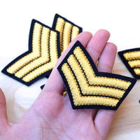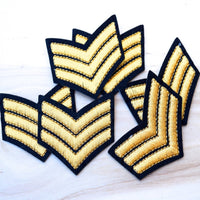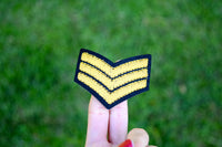 Iron on sergeant patch. Classic reverse arrow shape with gold metallic embroidery and set on black felt. I have personally added this to an over sized denim jacket on the upper arm. Also great for army jackets or parkas.