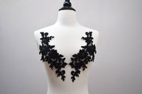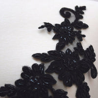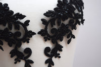 Elegant and formal black applique, heavily decorated with beading set of black mesh. The applique is mirrored/ symmetrical, making it a perfect addition for a neckline
