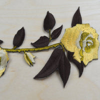 This patch features a beautiful classic rose with delicate leafs and stems in an elegant and modern shape. The rose is embroidered with a chic mustard yellow thread and the leafs are a rich brown color. The flower is accented with gold metallic thread, giving it an upscale flair. Iron backing allows you to easily apply heat to attach the item to your fabric. No need to sew!!