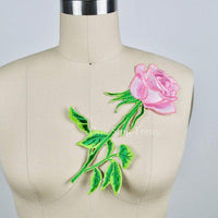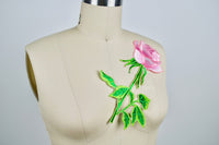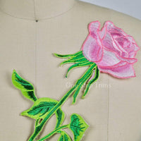 1 Pink Rose Green Stem and Leafs Large Patch Embroidery Applique