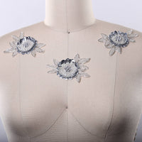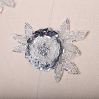 Beautiful and heavily sequined and beaded flower 3 dimensional effect applique in a gorgeous silver color. The item features beading and sequins in different shades of silver for a more unique and prominent look. Aluminum colored sequins with shimmery silver beads and grey round beads in the center of the flower.