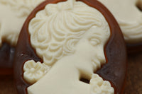 Beautiful plastic cameo features an elevated ivory silhouette of a woman. Set on a black or brown background and framed in silver or antique brass.