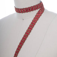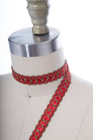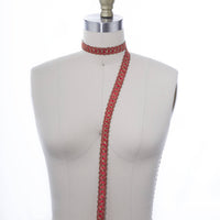 Red and metallic gold crossover gimp braid. The metallic gold is mixed with black threads to create a subtle antique look to the braids edges and center design.