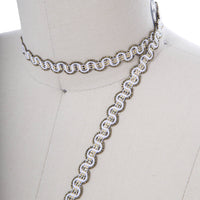 Royal roman style white and metallic gold crossover gimp braid. The metallic gold is mixed with black threads to create a subtle antique look to the braid's edges and center design.