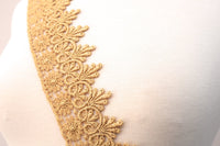 Contemporary Gold metallic lace with intricate design. Floral groundwork is perfect for groundwork costumes, gowns and home decor.