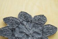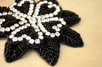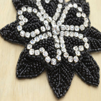 This is a two-tier flower applique that is made with delicate black beading and silver rhinestones. The bottom tier are the leaves and on top lays a five-petal flower. Silver rhinestones come together in heart-shapes.