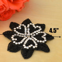 1 Patch/Applique 4" Black Beaded Double Layer with Silver Rhinestone and Heart Shape Flower