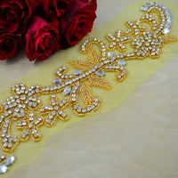 Rhinestones and gold beads are hand sewn onto yellow mesh, creating a branch-like pattern with leafs and small flowers.