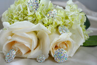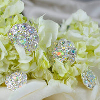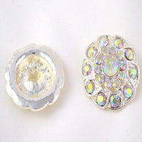 Classic cut and designed silver metal button with AB/ Multi-colored/ Iridescent rhinestones with metal shank backing. Perfect for garments, accessories and bridal bouquets.