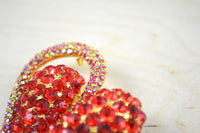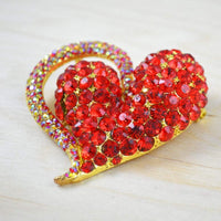 A large beautiful asymmetrical heart brooch that will complete any look, garment or accessory. Brightly shining red rhinestones beautifully cover the heart, and fine iridescent red rhinestones cover the arch.
