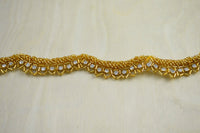 Fine beading and rhinestones come together to create a unique scalloped formal trimming. The trim features an iron on backing. This means there is no need to sew!