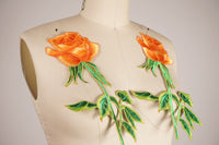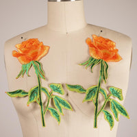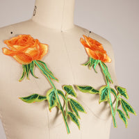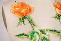 Beautiful Orange rose with vibrant green stems and leaves embroidery applique.