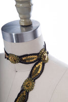 Gorgeous and unique gold non-stretch sequin trim with almond shape motif flowers and set on a high quality netting.